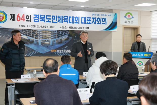 예천군(군수 김학동)은 4일 오전 11시, 예천군스타디움 1층 회의실에서 제64회 경북도민체육대회 출전을 위한 종목단체 대표자회의를 개최하고, 대회 전반에 대한 주요 일정과 운영 사항을 공유했다.