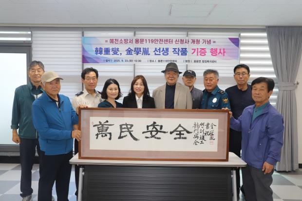 한중섭 선생은 ‘천재설소(千灾雪消)’라는 사자성어를 담은 작품을, 김학윤 선생은 ‘만민안전(萬民安全)’이라는 글귀를 친필로 써서 기증했다. 두 작품에는 “용문119안전센터가 재난을 눈 녹듯 신속히 해소해 지역 주민을 지켜 달라”는 바람이 담겼다.