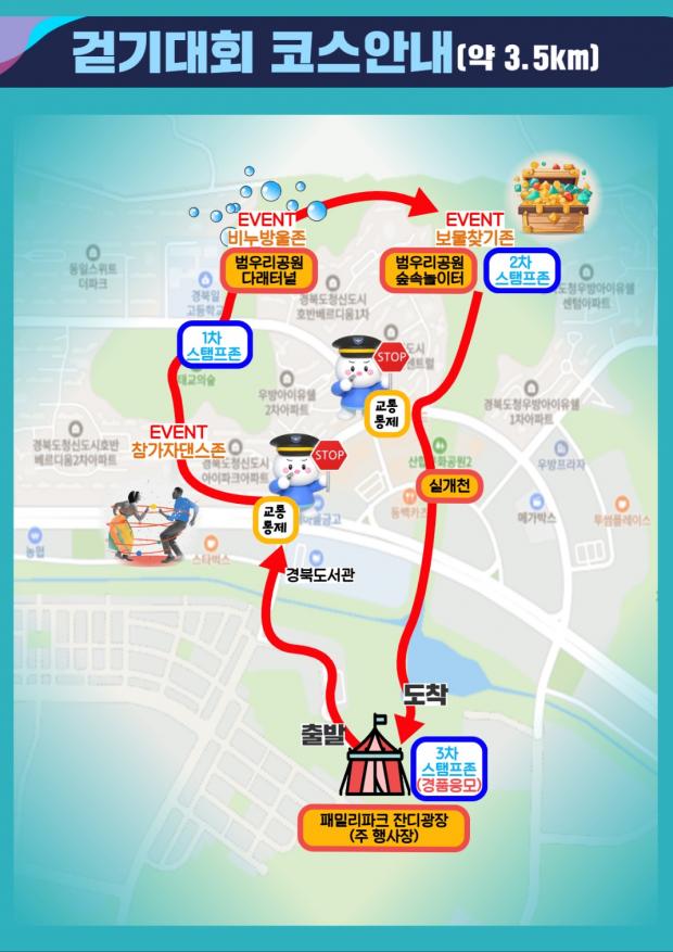예천군체육회가 주최·주관하고 예천군이 후원하는 이번 걷기 행사는 패밀리파크 잔디광장에서 출발해 범우리공원과 실개천을 거쳐 다시 패밀리파크 잔디광장으로 돌아오는 약 3.5km 코스로 진행된다.